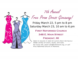Our 7th Annual Free Prom Dress Giveaway Event is back! Anyone in need of a prom dress, come to First Reformed Church Fremont on Friday, March 22 (5 pm to 8 pm) or Saturday, March 23 (10 am to 6 pm) to choose from our HUGE variety of new and gently used donated dresses and accessories in tons of colors, styles, and sizes. There are NO qualifications to attend this event - it is open to anyone in the community…