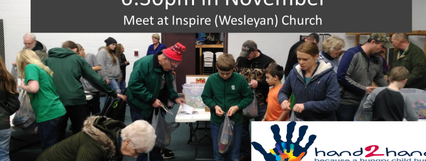 Tuesday’s in November are packing nights for Hand 2 Hand Ministry. Meet at Inspire (Wesleyan) Church room c at 6:30pm.