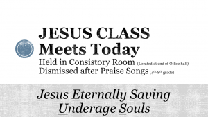 Jesus Eternally Saving Underage Souls This class is available for 4th-8th grade students and meets twice a month. Check out the calendar for dates