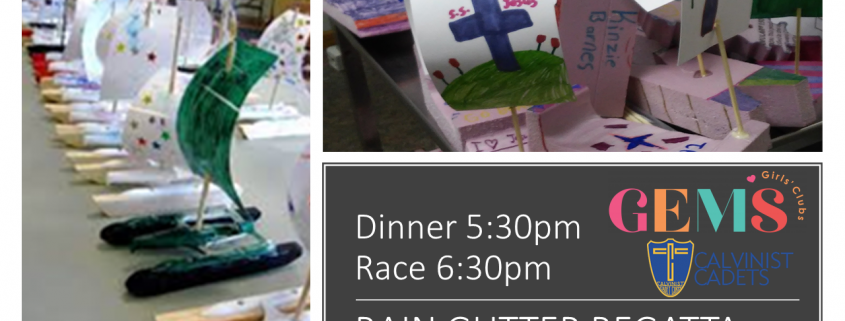 We invite you to a family evening of fun! Each year the GEMS Girls Club and Boys Cadets battle it out. The Rain Gutter Regatta event is a handmade foam boat powered by wind (straws) down a track(gutter).