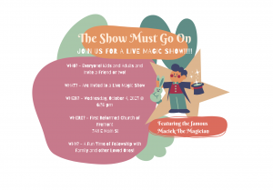 Join us on Wednesday, October 4 at 6:30 pm (during GEMS and Cadets meeting time) for a real, live magic show! The GEMS and Cadets kids will be treated to a fun, lively magic show by the famous Maciek the Magician. All in the community are invited (you don’t have to come to church here […]