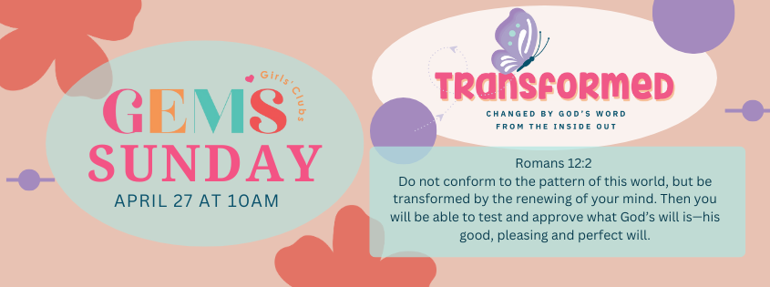 Sunday April 27 (during regular church service) we will be having GEMS Sunday! The girls will lead worship and we will celebrate all that the GEMS girls have accomplished this year. There will also be a Special Offering for the GEMS International Ministry. There will be baskets at the door after the worship service in which you can place your offering if you would like to participate. If you would like to give an offering to our GEMS program here at FRC, please specifically note “FRC GEMS” on your offering envelope or check. Hope to see you next week for GEMS Sunday!