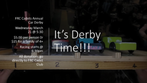 Join us at 5:30 pm for a pancake egg sausage and more dinner/ Recommend donations of $5.00 per person or $15.00 for a family of 4+. Racing starts at 6:30pm so arrive early to register your car and qualify for best in show prize. *All donations go directly to our FRC Cadet Club